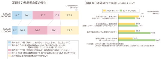 「どんな海外旅行をしてみたいか」という質問を同調査の結果と比較してみると、「海外で話題になっている場所へ行きたい」や「海外で話題になっている物を買ったり食べたりしたい」などの「海外志向」が大きく減少していました。また「話題になっている場所に行きたい」(コト志向)か、「話題になっている物を買ったり食べたりしたい」(モノ志向)かを比べると、2026年には、国内でも海外でも「コト志向」が「モノ志向」を上回っています。海外のメディア等を通じてもたらされる情報より、身近なSNSなどで話題のことが好まれるようになった可能性もありそうです(図表18)