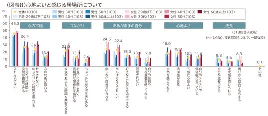 生活の幸福度が2年連続で減少する中、心地よい居場所の条件として「ストレスがない」がトップとなりました。特に若い年代では「がんばらなくてもいい」「好きなことだけを追求できる」が高く、無理をせず心穏やかに過ごしたいという欲求が強く表れています。