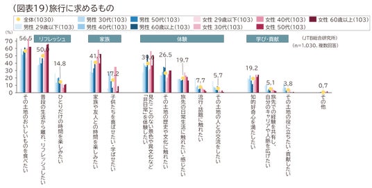 旅に求めるものは、上位から「その土地のおいしいものを食べたい(56.5%)」「普段の生活から離れ、リフレッシュしたい(50.0%)」「家族や友人との時間を楽しみたい(41.1%)」となりました。性年代別にみると、男性29歳以下は「ひとりだけの時間を楽しみたい(26.2%)」「流行・話題に触れたい(19.4%)」が全属性で最も高くなりました。また女性40代は「その土地の美味しいものを食べたい(73.8%)」「見たことのない景色や異文化など非日常を体験したい(56.3%)」が高いことに加え、子育て中も多いと考えられることから「家族や友人との時間を楽しみたい(58.3%)」「子供たちを喜ばせたい・学ばせたい(35.0%)」も高い結果となりました。また女性50代以上は「普段の生活から離れ、リフレッシュしたい」が高いなど、年代やライフステージによって旅に求めるものが異なることがわかります(図表19)