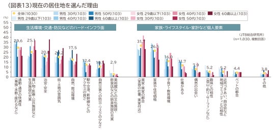 現在の居住地を選んだ理由については、上位から「実家・実家の都合(31.7%)」「通勤・通学の快適性(29.6%)」「家賃や住宅価格(26.5%)」となりました。性年代別にみると「趣味との相性」「仕事がある」は男性29歳以下、「実家・実家の都合」「買い物・医療・公共施設など生活施設の充実」は女性40代・50代、「治安・安全」は女性50代以上、「自然・周辺環境」「街・土地の雰囲気」は男女60代以上で高いなど、年代やライフステージによって重視するものが異なる様子がうかがえます(図表13)