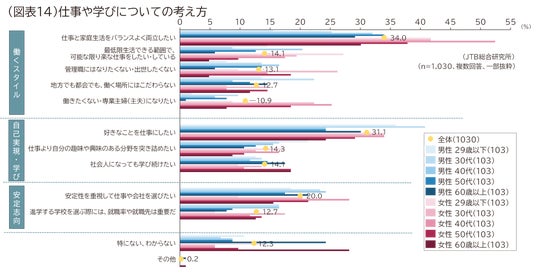 6. こだわりをもってお金を使うものの1位は「旅行」。物価高騰などの影響から前年より減少する項目が多い中、「旅行」に加え「投資や資産の運用」「自己啓発のための学費・受講費」など、将来に向けた投資は増加仕事や学びについては、上位から「仕事と家庭生活をバランスよく両立したい(34.0%)」「好きなことを仕事にしたい(31.1%)」「安定性を重視して仕事や会社を選びたい(20.0%)」となりました。性年代別にみると、男性29歳以下は「仕事より自分の趣味や興味のある分野を突き詰めたい(21.4%)」、女性29歳以下は「最低限生活できる範囲で、可能な限り楽な仕事をしたい・している(27.2%)」、女性30代は「管理職にはなりたくない・出世したくない(26.2%)」、女性40代は「仕事と家庭生活をバランスよく両立したい(52.4%)」「働きたくない・専業主婦になりたい(25.2%)」がそれぞれ最も高い結果となりました(図表14)