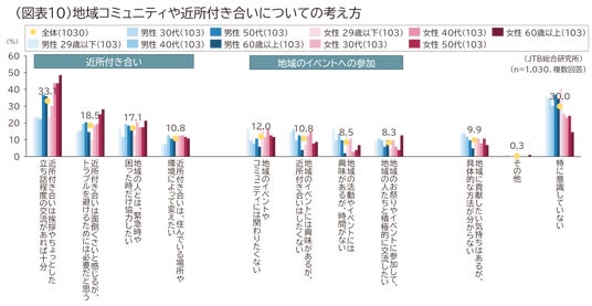 また近所付き合いについて聞いたところ「近所付き合いは挨拶やちょっとした立ち話程度の交流があれば十分」が33.1%で最も高く、次いで「近所付き合いは面倒くさいと感じるが、トラブルを避けるためには必要だと思う(18.5%)」「地域の人とは、緊急時や困ったときだけ協力したい(17.1%)」となりました。女性40代以上では「近所付き合いは挨拶や、ちょっとした立ち話程度の交流で十分」が4割以上となりました。一方、若年層の男性では、地域の活動やイベントに対して興味があるが「時間がない」「近所付き合いはしたくない」という層も一定数おり、ボトルネックが解消されれば地域との関わりに前向きになる可能性があります(図表10)