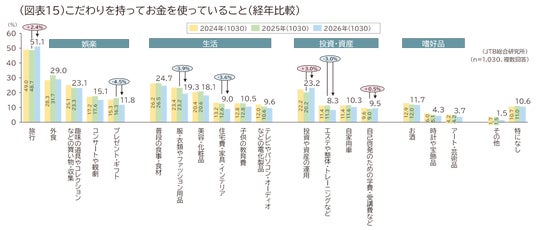 一方、こだわりをもってお金を使うものの1位は「旅行」でした。物価高騰などの影響から前年より減少する項目が多い中、「旅行」に加え「投資や資産の運用」「自己啓発のための学費、受講費」は増加しました。日常ではストレスを避けつつも、心の充足や将来につながるものには積極的な姿勢がうかがえます。