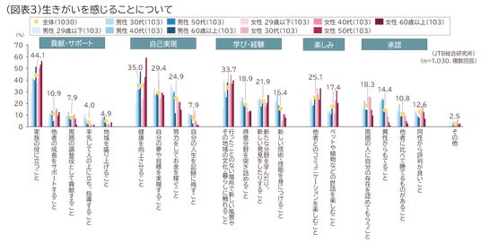 生きがいを感じることは、上位から「家族の役に立つこと(44.1%)」「健康を向上させること(35.0%)」「行ったことのない場所で新しい風景やその地域の文化・暮らしにふれること(33.7%)」となりました。年代別にみると「家族の役に立つこと」「健康を向上させること」は、年代が高くなるほど増える傾向にあります。一方「努力してお金を稼ぐこと」は男性29歳以下で最も高い37.9%、「自分の夢や目標を実現すること」は女性29歳以下で最も高い39.8%となりました(図表3)