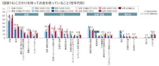 性年代別にみると、男女60歳以上は「旅行」、女性29歳以下・30代は「コンサートや観劇」「美容・化粧品」、男性30代~50代は「投資や資産の運用」が高い結果となりました。特に「コンサートや観劇」については、男性29歳以下が6.8%であるのに対し、女性29歳以下は28.2%で、同年代でも大きな差がありました(図表16)