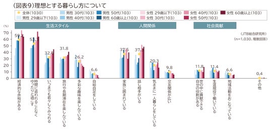理想とする暮らし方については、上位から「経済的な余裕がある(59.2%)」「時間に追われることなくゆったりと過ごす(53.3%)」「家族に囲まれている(37.5%)」となりました。性年代別にみると、女性40代以上では「時間に追われることなくゆったりと過ごす」「話し相手がいる」「いつまでも若々しくみられる」が高く、男性30代と女性29歳以下では「多彩な趣味を楽しんでいる」が高くなりました(図表9)