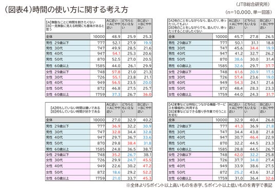 次は日常生活でのタイパ、およびメンパを重視した行動について聞いてみました。時間の使い方に関する考え方では「一見無駄に見える時間にも意味があると思う」は男女ともに60代以上で、「何もしていない時間が好きである」は特に女性30代以上で高くなりました。男女ともに40代以下で「無駄なことに時間を割きたくない」「何もしていない時間は嫌いである」が高い一方で、「他のことをしながらなら、並んだり、待ったりしてもよい」は年代が低くなるほど高くなりました。無駄な時間は避けたい一方で、何かをしながらであれば「無駄ではない」と考える傾向が若い年代にはありそうです。「家事などは時短につながる機器・サービスを積極的に利用する」が男女29歳以下では4割を超えましたが、女性50代では25.2%と最も低くなりました(図表4)