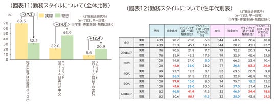 理想の通勤頻度・働き方と現実のギャップ、現在の居住地の選び方について聞きました。理想については「完全出社(32.2%)」「ハイブリッド(46.9%)」「フルリモート(月1、2回程度以下の出社)(20.9%)」となりました。一方、実際の頻度と比較すると「完全出社(69.5%)」は理想との差37.3%となるなど、すべての項目で理想の半分以下となり、理想と現実に乖離があることがわかりました(図表11、12)