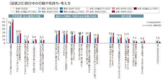 最後に旅行中の行動や気持ち、考え方について聞きました。「混雑や行列はできるだけ避けたい(51.2%)」「予想外の出来事は、できるだけ起こってほしくない(26.1%)」といった、不安回避・安心を重視したいわゆる“メンパ行動”が上位となりました。続いて「予定が変わっても、別の楽しみに置きかえられる(26.0%)」「未知の土地を歩くこと自体がワクワクする(24.9%)」「多少のトラブルも、旅の醍醐味だと感じる(22.7%)」など、旅行先での予期せぬ出来事やトラブル、未知を楽しむ行動が続きました。