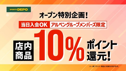 期間中、店内商品をお買い上げで「アルペンポイント10%還元」を実施。※当日入会(年会費無料)の方も対象です。一部対象外商品がございます。