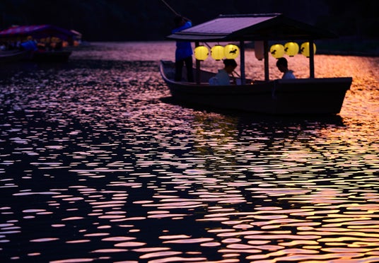 嵐山の夏の風物詩である「鵜飼」を、貸し切りの屋形舟「翡翠」から間近に眺める贅沢な夕涼みのひとときを過ごせます。舟の中では、日中の暑さを忘れるような涼やかな風に吹かれながら、お酒とおつまみを片手に、夏の夜の時間を独占できる優雅なひとときです。かがり火が水面を赤々と照らす幻想的な雰囲気の中、鵜匠が巧みに鵜を操る古典的な漁法を目の当たりにすることができます。平安貴族も愛でたといわれる文化に触れながら、時を忘れるような雅な夜の時間を過ごせます。