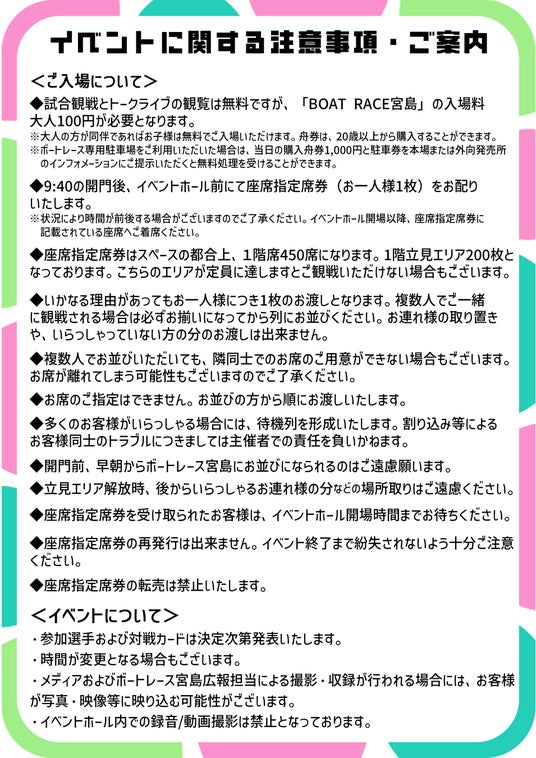 ※9:40よりイベントホール前にて座席指定席券(先着約450席予定)をお配りします(お一人様1枚)