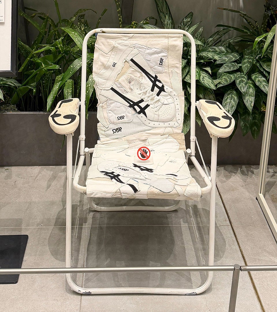 廃棄スニーカーと廃棄イスとの組み合わせで新たな生をいれた作品に仕上げました。