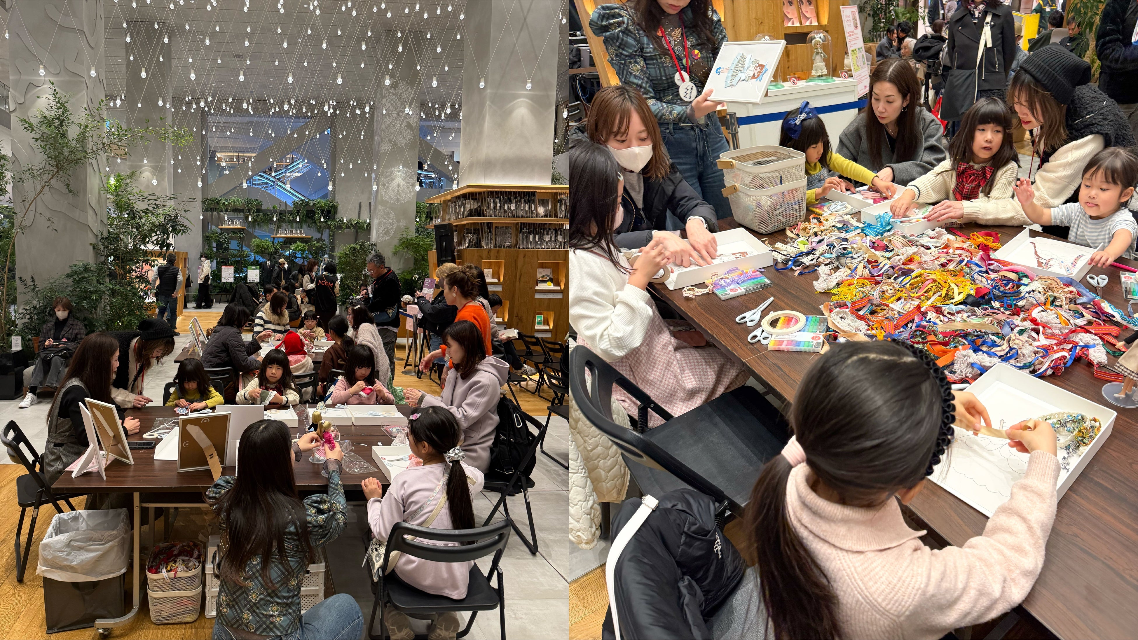 ワークショップでは、体験を通して素材の見え方が変化する場面も見られました。今回使用した布やリボンは、まだ十分に使える状態でありながら、廃棄される予定だった素材です。ワークショップの冒頭でスタッフがその背景を紹介し、これらの素材を使って作品づくりを行うことを参加者に伝えました。その後、撮影スタッフから「これは元々何だったかわかる?」と尋ねられた子どもが「ゴミ!」と答える場面もありました。しかしワークショップ終了後、同じ素材で作られたリカちゃんの衣装を前に、親子からは「捨てられなくてよかったね」という声が聞かれました。体験を通じて、素材の価値や見え方が変わる瞬間が生まれていました。