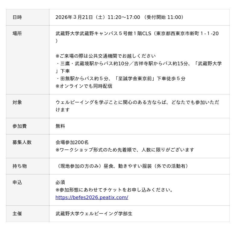 武蔵野大学ウェルビーイング学部(東京都西東京市、学長:小西 聖子)は、3月21日(土)にウェルビーイング学部生主催のスペシャル企画「ビーフェス」を開催します。本イベントは、「THE WELLBEING WEEK 2026」のコンテンツの一つとして開催されるものです。2017年からスタートした「THE WELLBEING WEEK」は今年10周年を迎え、本年は3月13日(金)より世界幸福デーである3月20日を含む10日間にわたって開催されます。
