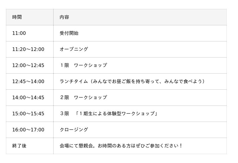 ・現地参加の方は、外での活動、昼食会がありますので、準備をして来場するようお願いします