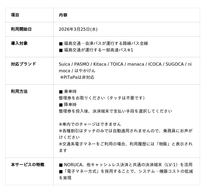 福島交通・会津バスでは、これまで地域のお客様向けのICカード「NORUCA(ノルカ)」、「AIZU NORUCA(アイヅノルカ)」のほか、クレジットカード等のタッチ決済、QRコード決済、電子マネー(WAON、nanaco)などのキャッシュレス決済手段を導入してまいりました。今回、新たに交通系電子マネーが利用可能となることで、県外からの来訪者や観光で訪れるお客様などが、お手持ちのSuica/PASMO等でそのままバスをご利用いただけるようになります。