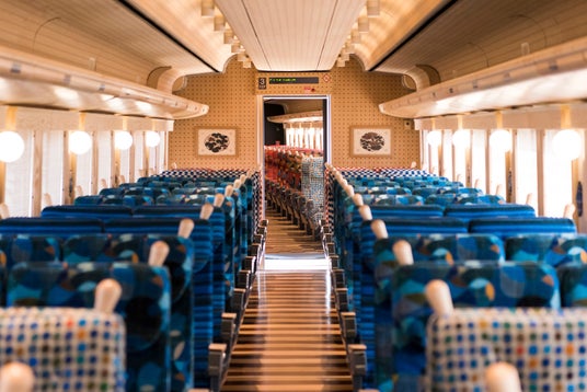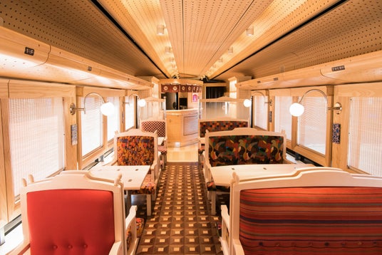 富士山に一番近い鉄道・富士急行線の大月~河口湖間を走る観光特急。工業デザイナー水戸岡鋭治氏がデザインを手がけた錆朱色の車体が特徴です。車内は木材と布を用いた温かみのある空間で、額縁のような車窓から富士山を望むことができます。