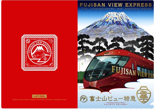 メタルキーホルダーは、富士急行線のロゴの中に富士山ビュー特急の車体デザインを組み込んだ新たなデザインとなっており、重厚感のあるメタル素材が特徴で、10周年を記念する特別感のある仕上がりとなっています。クリアファイルは10周年を記念した新デザインで、富士山ビュー特急の周年を祝うように紙吹雪が舞う華やかなデザインとなっています。