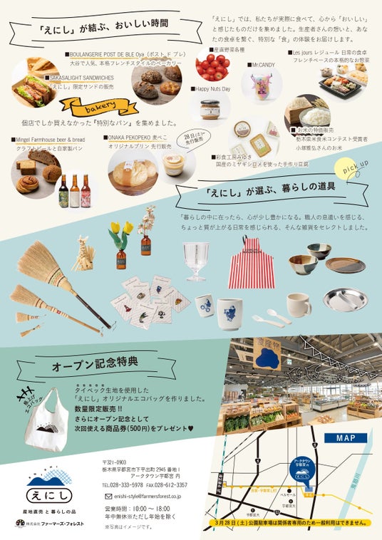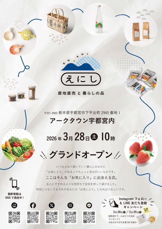 農業・食・観光を融合させた地域プロデュースを展開する、株式会社ファーマーズ・フォレスト(本社:栃木県宇都宮市、代表取締役:松本 謙)は、2026年3月28日(土)、宇都宮市下平出町のアークタウン宇都宮内に、新たな路面店『えにし ~産地直売と暮らしの品~』をオープンいたします。
