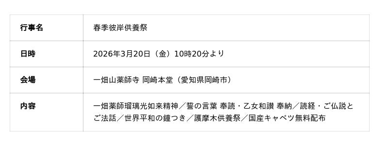 一畑山薬師寺(愛知県岡崎市)は、2026年3月20日(金)10時20分より岡崎本堂にて「春季彼岸供養祭」を厳修いたします。春の彼岸にあわせて行われる本行事は、ご先祖様への感謝の気持ちをあらためて捧げるとともに、自身の生き方を見つめ直す供養祭です。ご家族で参列し、祈りを捧げる春の年中行事として、多くの方にご来山いただいています。