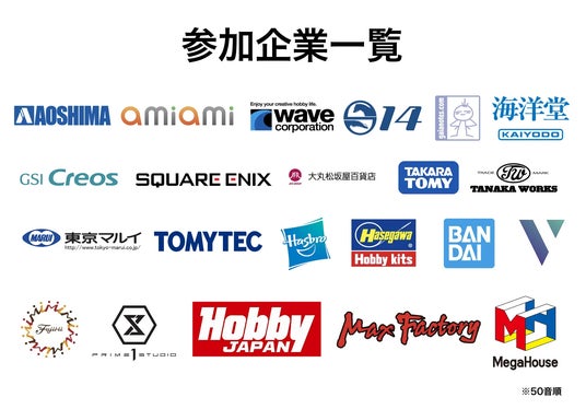 青島文化教材社/あみあみ/ウェーブ/S14/ガイアノーツ/海洋堂/GSIクレオス/スクウェア・エニックス/大丸松坂屋百貨店/タカラトミー/タナカ/東京マルイ/トミーテック/ハズブロ/ハセガワ/BANDAI SPIRITS/V/フジミ模型/Prime1Studio/ホビージャパン/マックスファクトリー/メガハウス