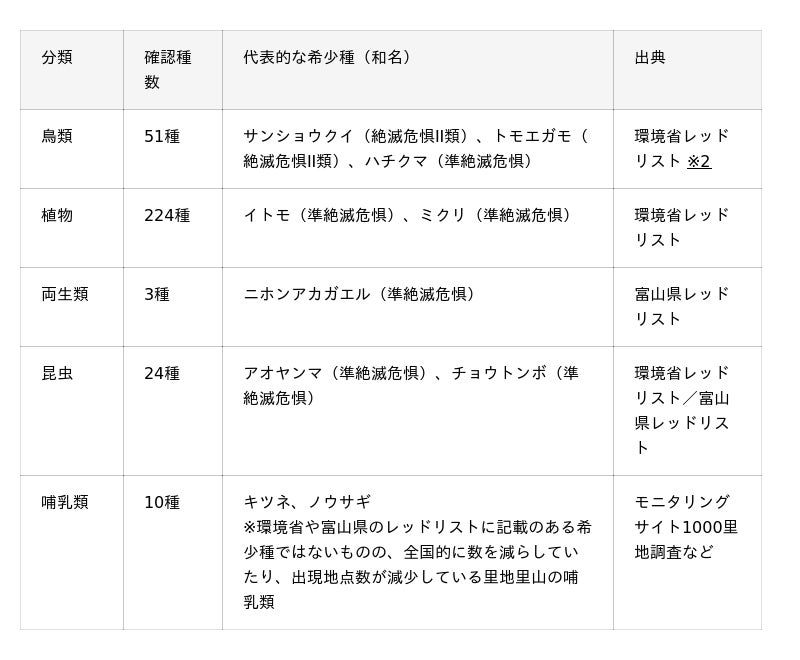 総面積99haのうち63.1haが認定され、希少種を含む314種の動植物が確認されています(調査:2024年6月から2025年1月)。なお、富山県小矢部市での自然共生サイト認定は本件が初めてです。