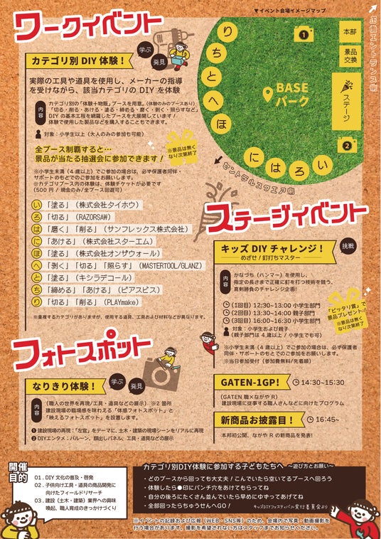 本イベントは、DIY文化の普及・啓発をはじめ、子ども向け工具・道具の開発に向けたフィールドリサーチ、さらに建設(建築・土木)業界への興味喚起と未来の職人育成のきっかけづくりを目的とした、新しい形の体験型エンターテインメントイベントです。