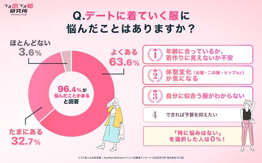 一方、今回のイベント応募者への事前アンケートでは、96.4%が「デート服に悩んだことがある」と回答。悩みの内容は「年齢に合っているか不安」「体型変化が気になる」「自分に似合う服がわからない」が上位を占めました。
