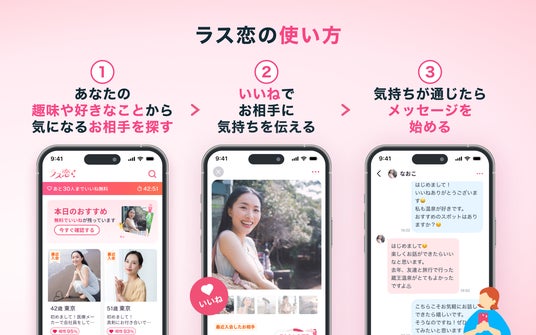 「恋する自由とときめきが、すべての人に開かれた社会をつくる。」をミッションに掲げ、40歳以上を対象としたマッチングサービス「ラス恋」を運営しています。グループ全体で9年以上にわたりマッチングアプリ事業を展開しており、ISMS認証を取得するなど安心・安全な運営体制を確立。