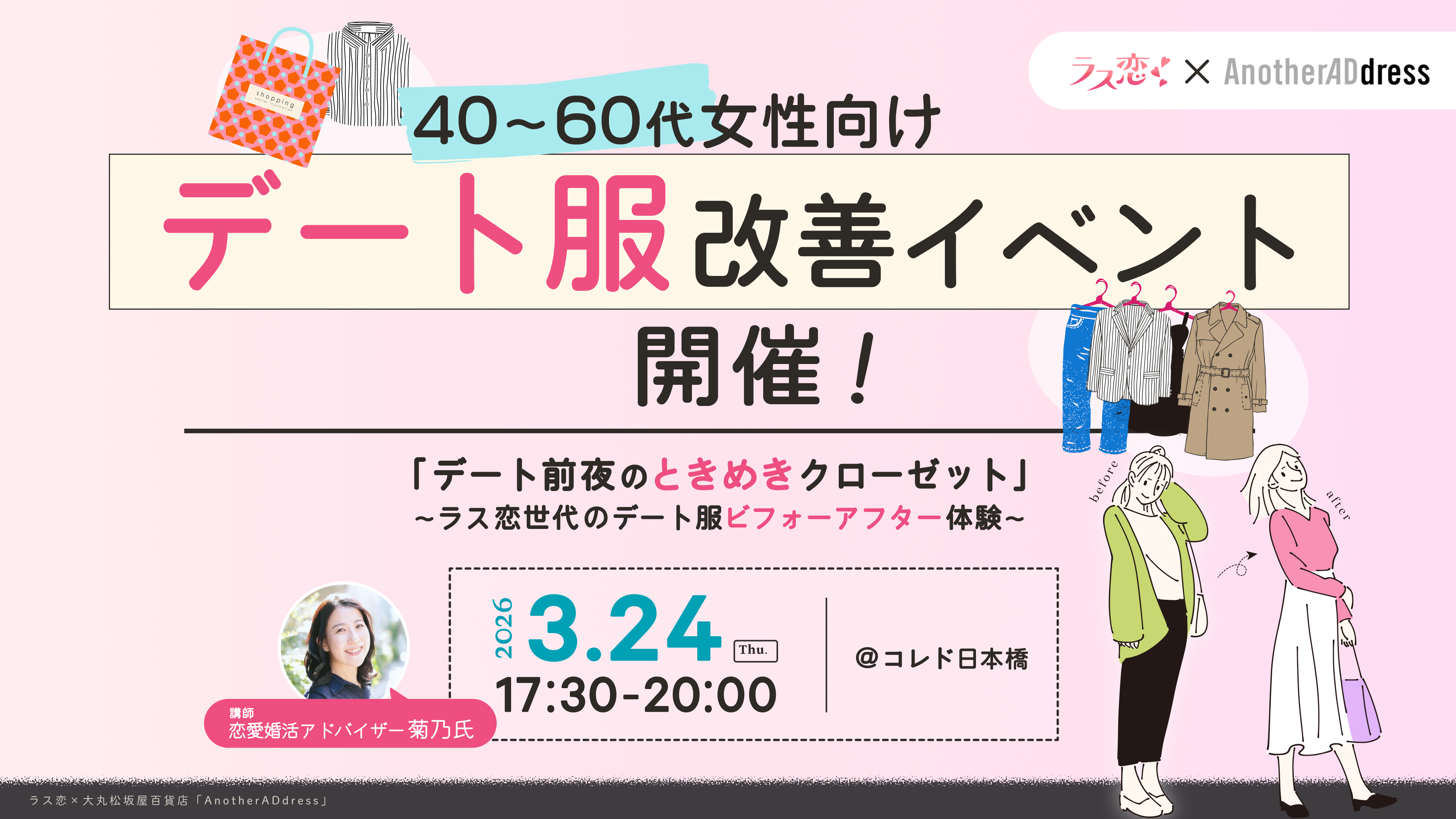 イベント名:デート前夜のときめきクローゼット~ラス恋世代のデート服ビフォーアフター体験~日時:2026年3月24日(火)17:30開場/18:00開始/20:00終了