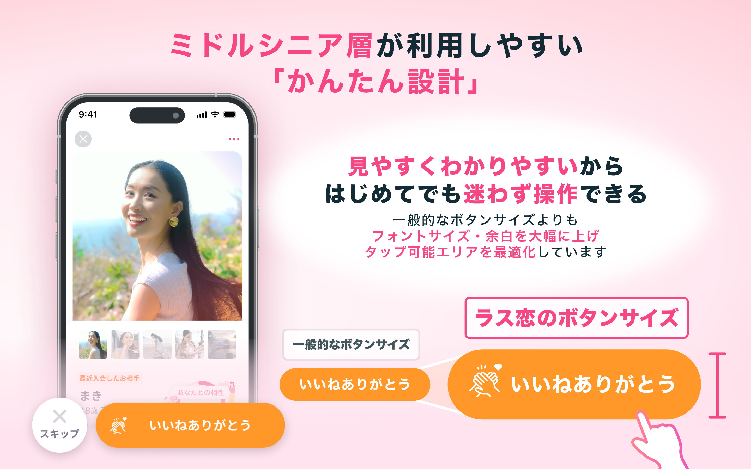 独自AIを活用した「顔写真撮影サポート」や「話題のレコメンド」など、マッチングアプリ初心者の大人世代でも迷わずご利用いただける機能を搭載。年齢にとらわれずこれからの人生を楽しむ前向きな方々に選ばれています。