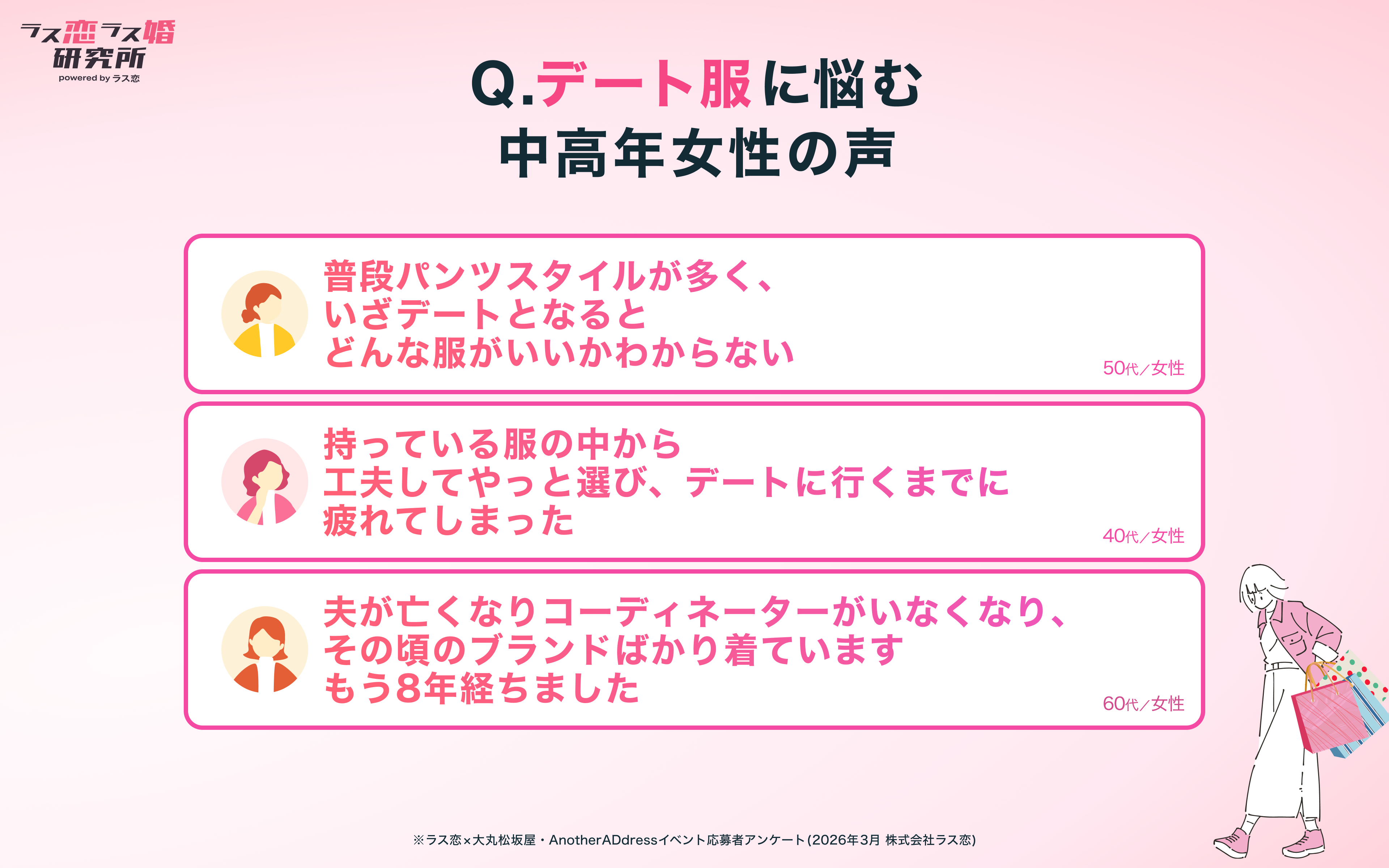 「普段パンツスタイルが多く、いざデートとなるとどんな服がいいかわからない」(50代女性)、「持っている服の中から工夫してやっと選び、デートに行くまでに疲れてしまった」(40代女性)、「夫が亡くなりコーディネーターがいなくなり、その頃のブランドばかり着ています。もう8年経ちました」(60代女性)