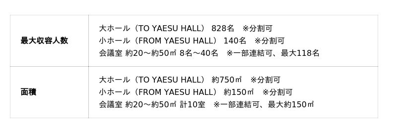 TOFROM YAESU TOWERの5階・6階に設置される「東京建物 ぴあ カンファレンス」は、最大828席収容可能な大ホール「TO YAESU HALL」、最大140席収容可能な小ホール「FROM YAESU HALL」の2つの平土間ホールと様々なシーンでご活用いただける10の会議室で構成されます。