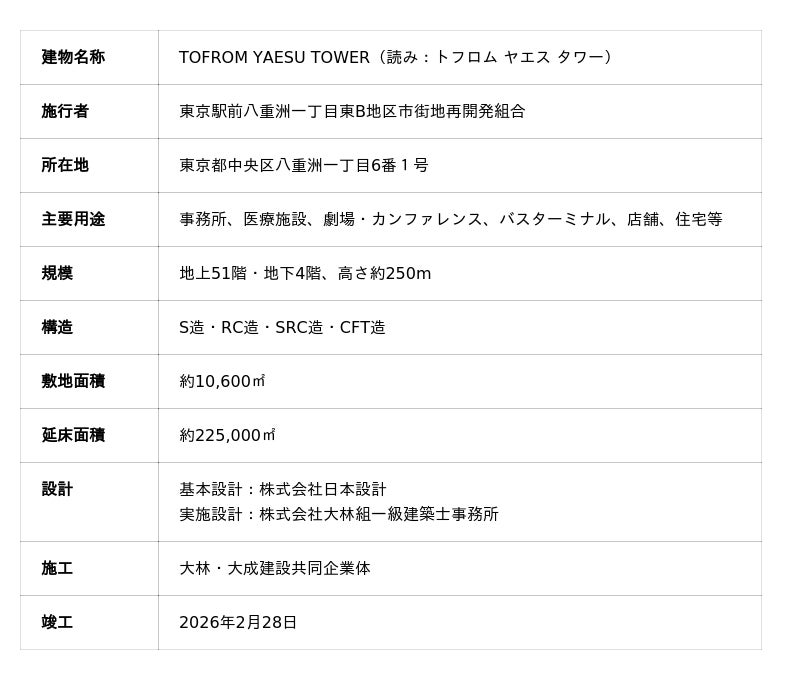 TOFROM YAESU TOWERは、2026年2月28日に竣工した、東京駅八重洲口前に所在する地下4階、地上51階の大規模複合ビル。八重洲地下街(ヤエチカ)を介し東京駅に直結し、オフィス、商業施設、劇場・カンファレンス、バスターミナル、医療施設など多様な用途で構成され、国際都市東京の玄関口にふさわしい都市機能の強化と国際競争力の向上に貢献します。