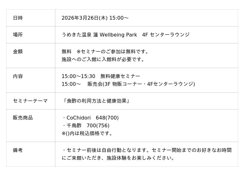 また会場では、京都でしか手に入らないことでも知られる「千鳥酢」から生まれた小さな酢「CoChidori(こちどり)」を同施設で限定販売いたします。通常は京都でしか販売していない「CoChidori」が、今だけ大阪で購入できる特別な機会です。温泉で身体を整えながら、食からはじめる健康習慣を学んでみませんか。