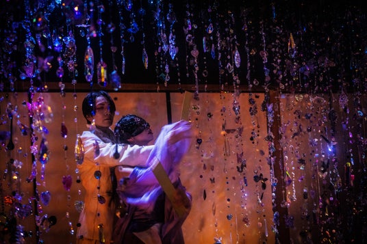 パーフォーマンスが繰り広げられる空間は、登場人物の感情を象徴する空間から構成されており、花や光による空間演出で、蜷川実花の鮮烈な色彩で映画の世界に入り込んだような体験を創り出します。演劇のために作られた舞台ではなく、北野天満宮の歴史ある建築の中で行うことで、北野天満宮の歴史が持つ、木造建築の空気感、その場所にしかない要素が作品の一部となり、観客は単なる舞台鑑賞ではなく歴史の時間の中に入り込む体験を味わいます。