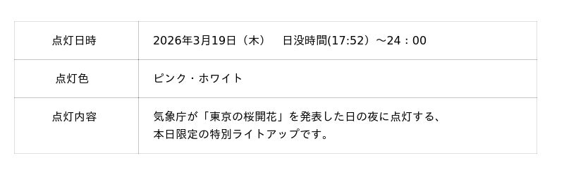 東京への桜前線の到達を祝し、東京タワーは、この日限定の特別ライトアップ「桜開花宣言インフィニティ・ダイヤモンドヴェール」を、本日の日没より24:00まで点灯します。