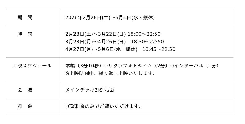 春の風情をより深く楽しめる仕掛けとして、桜色に染まる東京の夜景を同時に写真に収めることができる「サクラフォトタイム」が本編の後に新登場します!