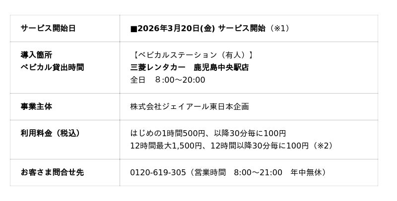 ○この度、三菱自動車ファイナンス株式会社と連携拡大し、「三菱レンタカー 鹿児島中央駅店」で3月20日よりサービスを開始します。鹿児島県での展開は初めてとなります。三菱レンタカーでは、ベビーカーや大きなお荷物をお持ちの方でも安心してご利用いただけるよう、用途に合わせた車種をご用意しております。ご家族との大切なひとときを、より快適にお過ごしいただけるよう、心を込めてサポートいたします。