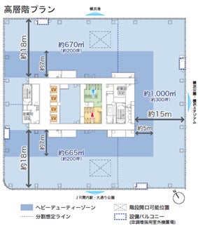 オフィスフロアは1フロア約2,100~2,300平方メートル 、天井高2,800mmの無柱空間で、部署を横断した同一フロア運用や将来的なレイアウト変更にも柔軟に対応できます。また、JR関内駅南口から目の前に位置する抜群のアクセス性に加え、横浜港や横浜公園、横浜スタジアム、さらに晴天時には富士山まで見渡せる眺望はオフィスワーカーの満足度を高めます。