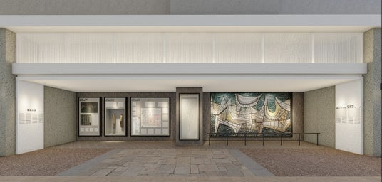 この展示スペースには、旧市会棟にあった泰山タイルレリーフアート作品「海・波・船」の一部を移設保存。かつ、旧市会棟本会議場の天井レリーフを3Dスキャンし縮小・再現しています。その他、この地の歴史に関する展示をご覧いただけます。