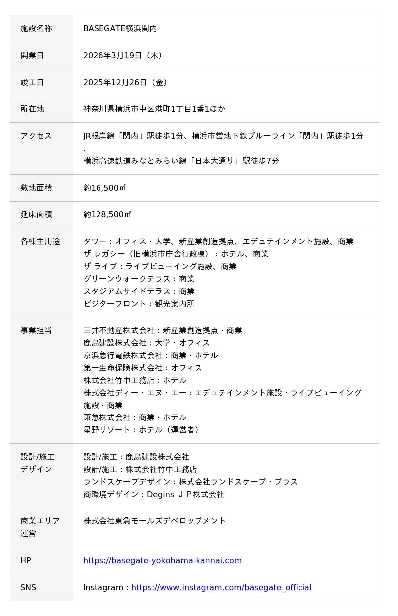 三井不動産株式会社(以下「三井不動産」)を代表企業とする、鹿島建設株式会社、京浜急行電鉄株式会社、第一生命保険株式会社、株式会社竹中工務店、株式会社ディー・エヌ・エー(以下「DeNA」)、東急株式会社、星野リゾートの8社は、2026年3月19日(木)11時に「BASEGATE横浜関内」を開業いたしました。