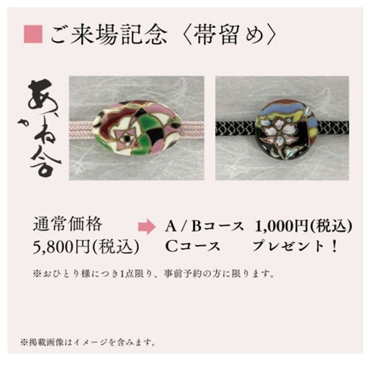 ■ 来場特典ご来場記念として「あかね会」の帯留め(通常価格 5,800円・税込)を特典価格、または無料にてご提供いたします。