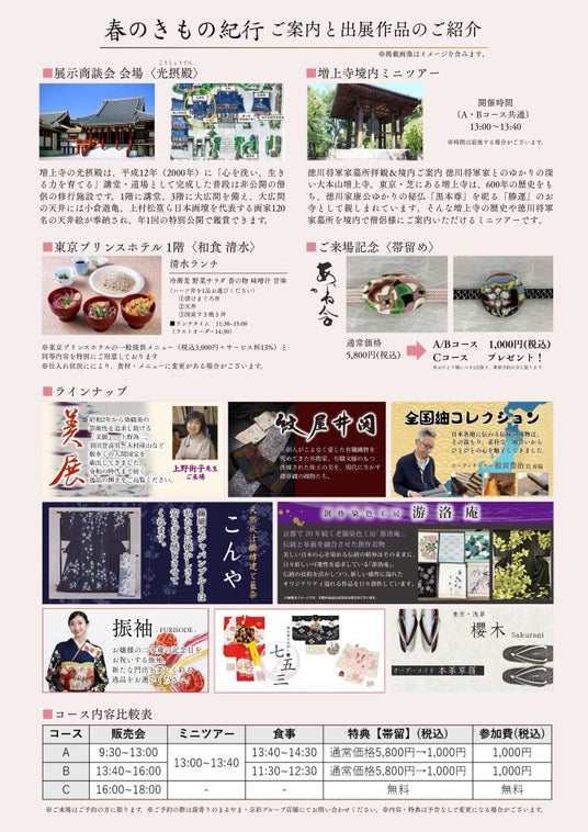 2026年4月16日(木)から19日(日)の4日間、京都丸紅株式会社および まるやま・京彩グループは、東京・芝にある大本山増上寺「光摂殿」にて、特別きもの展示商談会「春のきもの紀行」を開催いたします。
