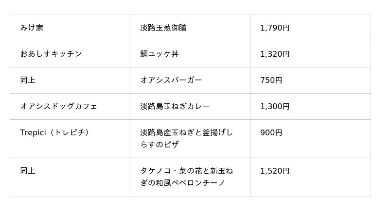 今回のフェアには、施設内の飲食店5店舗と物産館が参画し、それぞれが淡路島たまねぎをふんだんに使用した多彩なメニューや商品をご用意します。飲食店では、淡路島たまねぎの甘みや旨みを活かしたメニューを提供し、物産館では新玉ねぎの販売をはじめ、スープやドレッシングなど人気の加工商品も多数取り揃えます。旬の味覚をその場で味わい、ご自宅用やお土産としても楽しめる内容となっています。
