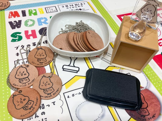 ブースでは、12時から15時までの間に計4回、各回10名限定で「豚革ミニワークショップ」を実施しました。参加者は“豚の革”を使ってオリジナルキーホルダーづくりに挑戦、クイッピースタンプを革に押し色を塗ったり、金具を取り付けたりしながら制作を楽しみました。