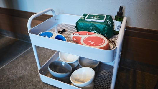 ケージやフードボウルなどのアメニティも備え、愛犬と安心して過ごせる環境。