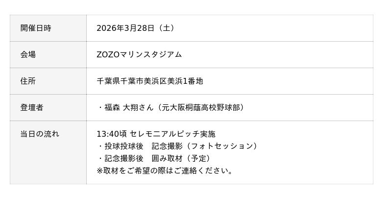 本始球式は、千葉ロッテマリーンズ一軍コーチであり大阪桐蔭の先輩でもある西岡剛コーチの提案により実現しました。希少がんと闘いながらも挑戦を続ける福森さんが、未来への希望をこめた魂の一球を投じます。