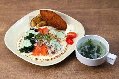 宮城県のプライドフィッシュ「みやぎサーモン」、「みやぎの殻付カキ」、「みやぎのわかめ」を使い、南三陸の海の魅力を余すことなく包み込んだタコス。口いっぱいに広がる海の幸の旨味が堪能できる一品。「みやぎのわかめ」のスープ付き。
